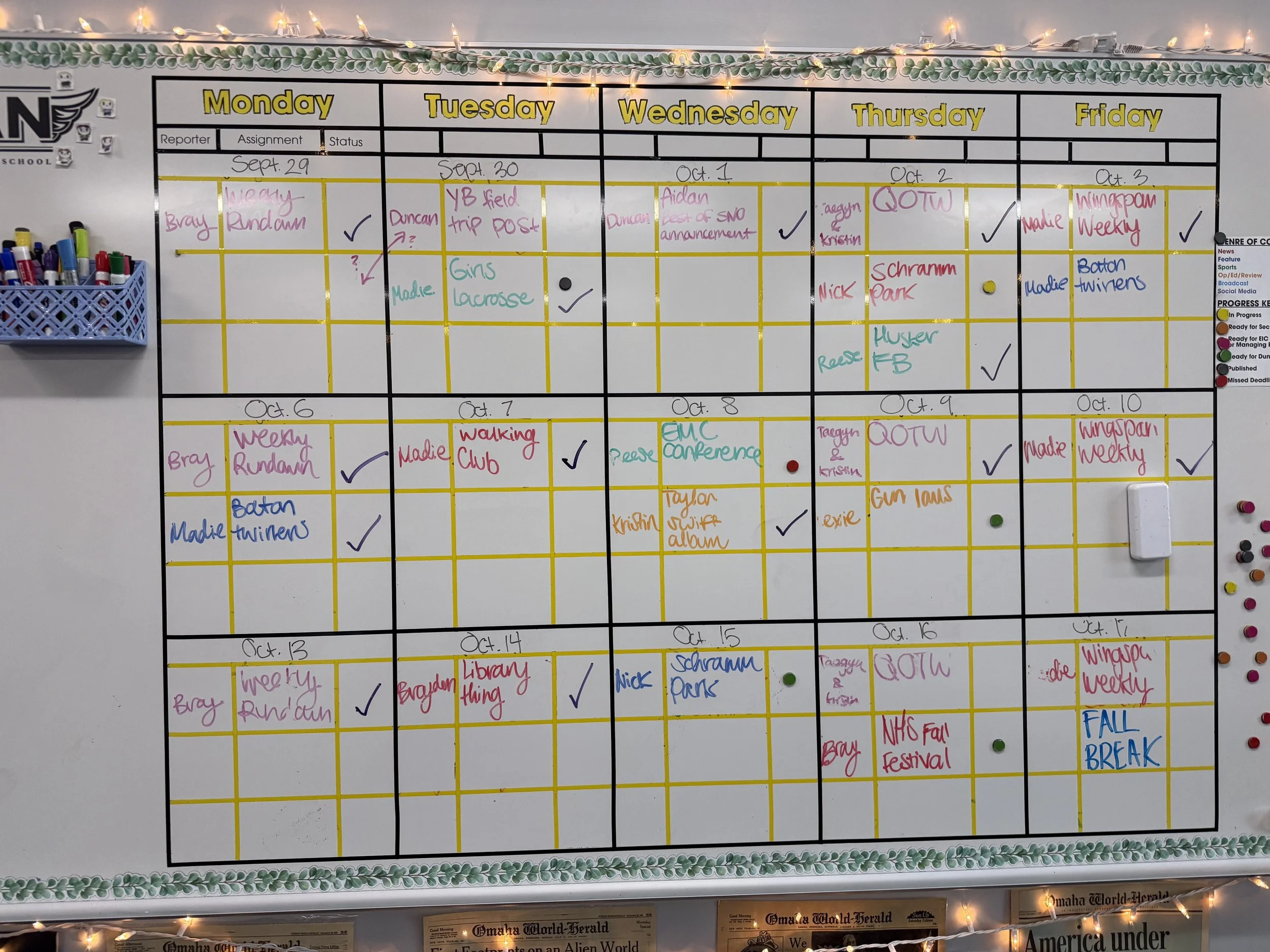 Each day, I start the staff off with a meeting. I do I quick run through of what staff members are working on, events that need covered, tasks that need accomplished, any edits I made the previous night or any other general announcements. Our color-coded calendar allows me and the staff to keep track of what story needs to be published on what day. This provides a helpful guide to keep our site full of fresh, diverse content.