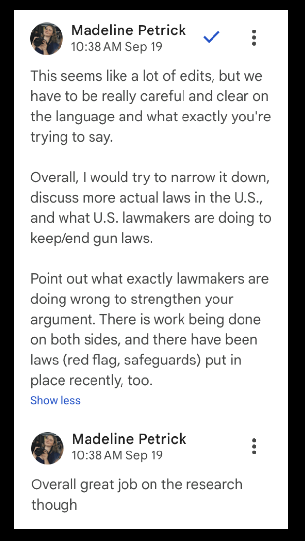 I use Google Docs to revise for grammar, AP style and overall quality, leaving most suggestions digitally. I also meet with reporters in person to discuss article goals and help them clarify their ideas.